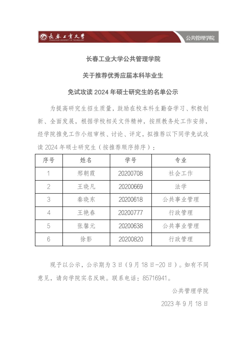 长春工业大学白嫖网 关于推荐优秀应届本科毕业生 免试攻读2024年硕士研究生的名单公示