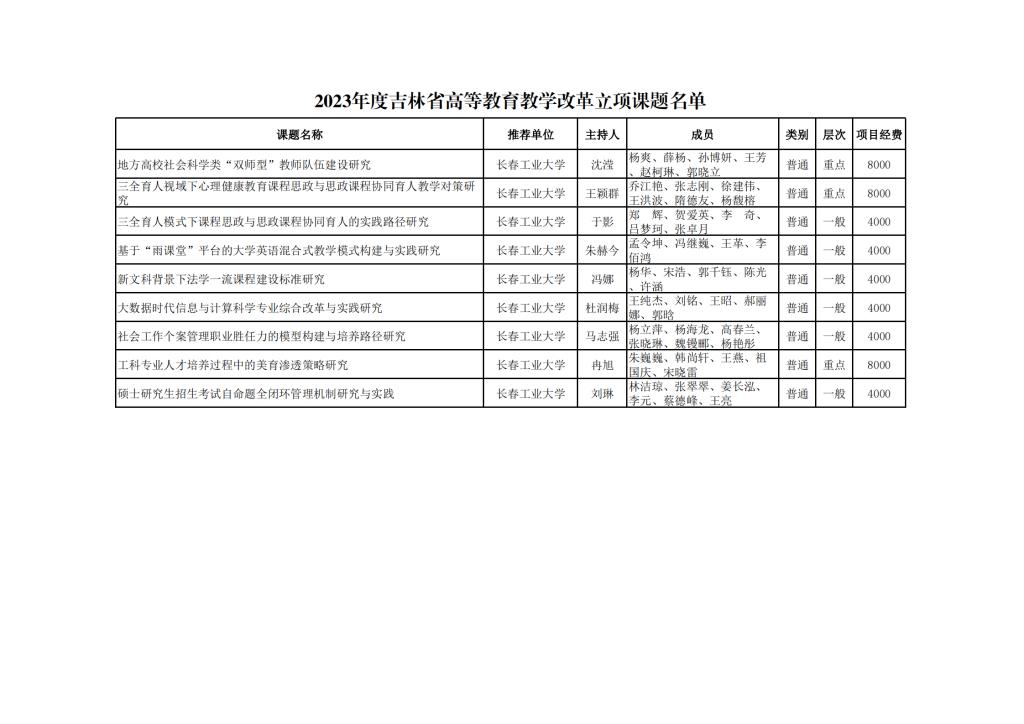 长春工业大学-2023年度吉林省高等教育教学改革立项课题名单