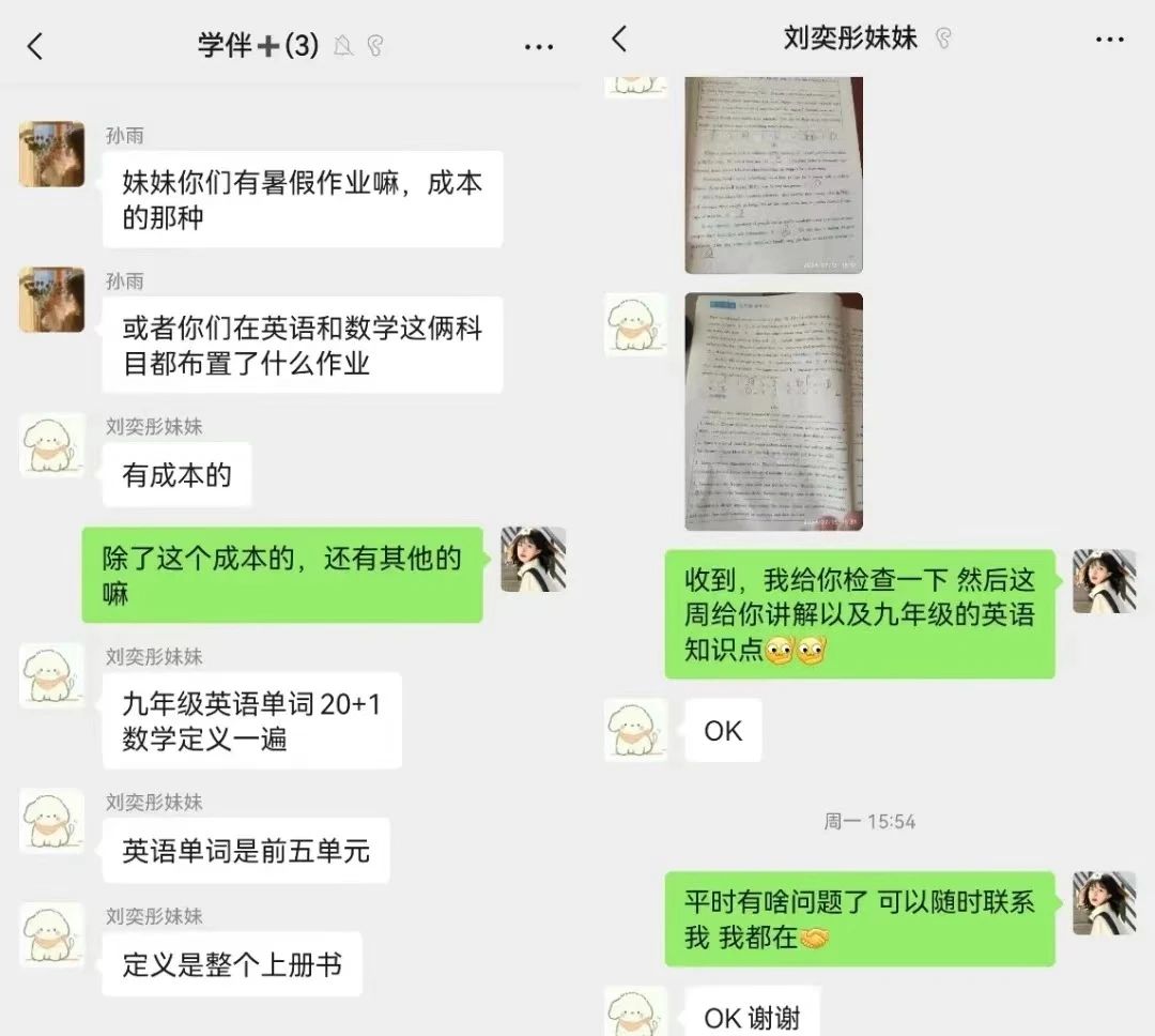 在这次“学伴+”志愿活动中,我的伴学对象是一名即将升初三的学生。对于她的教学,我们采用了多对一的方式,由我来负责讲解英语。在英语方面,我给他讲解了暑假作业里的错题以及重要知识点。此外,讲授了九年级的新课,使其提前学习新知识。在了解她的单词背诵和语法方面掌握情况,我为她制订了背诵计划,也会定期进行检查背诵情况。看到她一点点进步,我也由衷为她感到高兴。