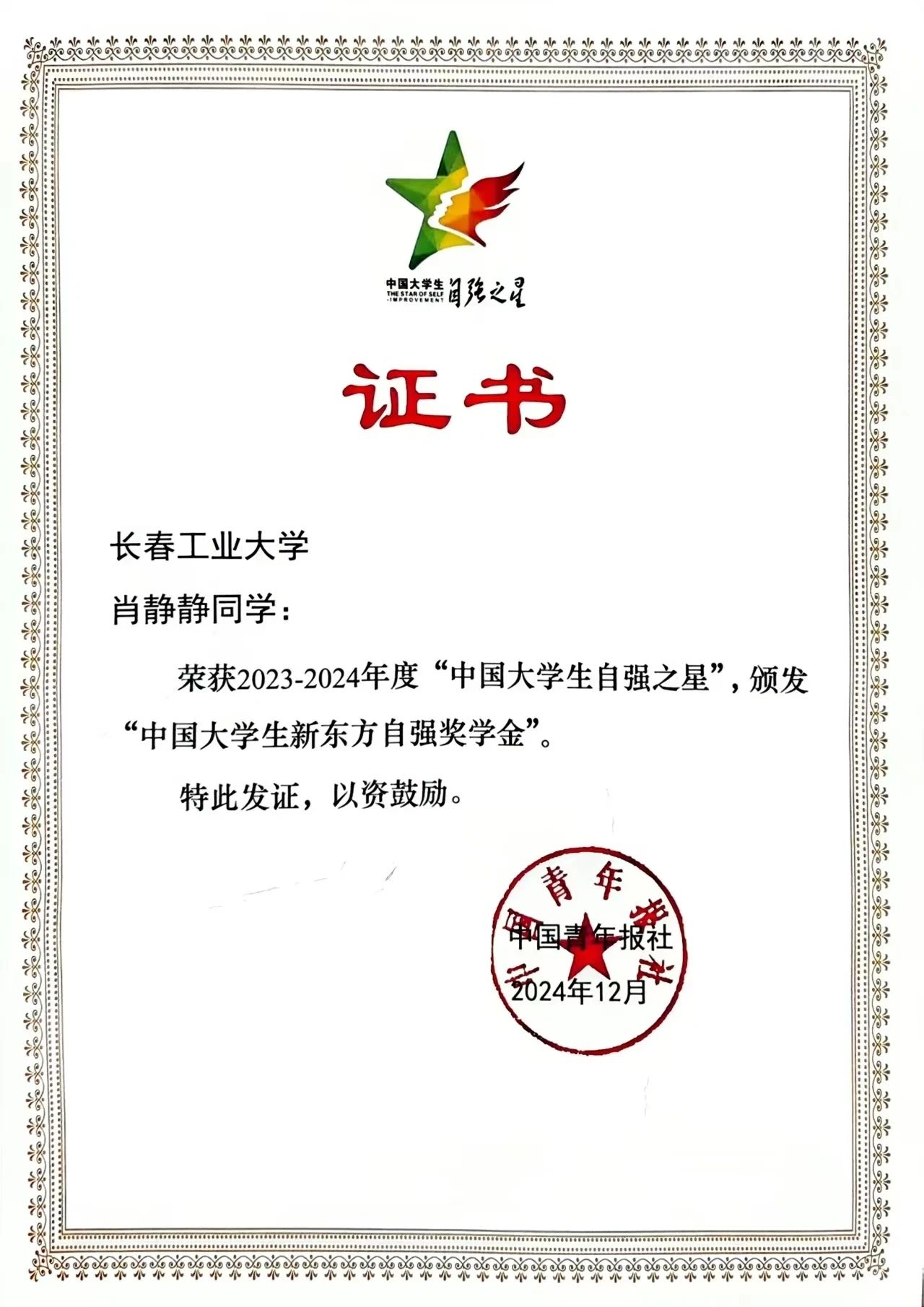 肖静静同学获得2023-2024年度“中国大学生自强之星”荣誉称号