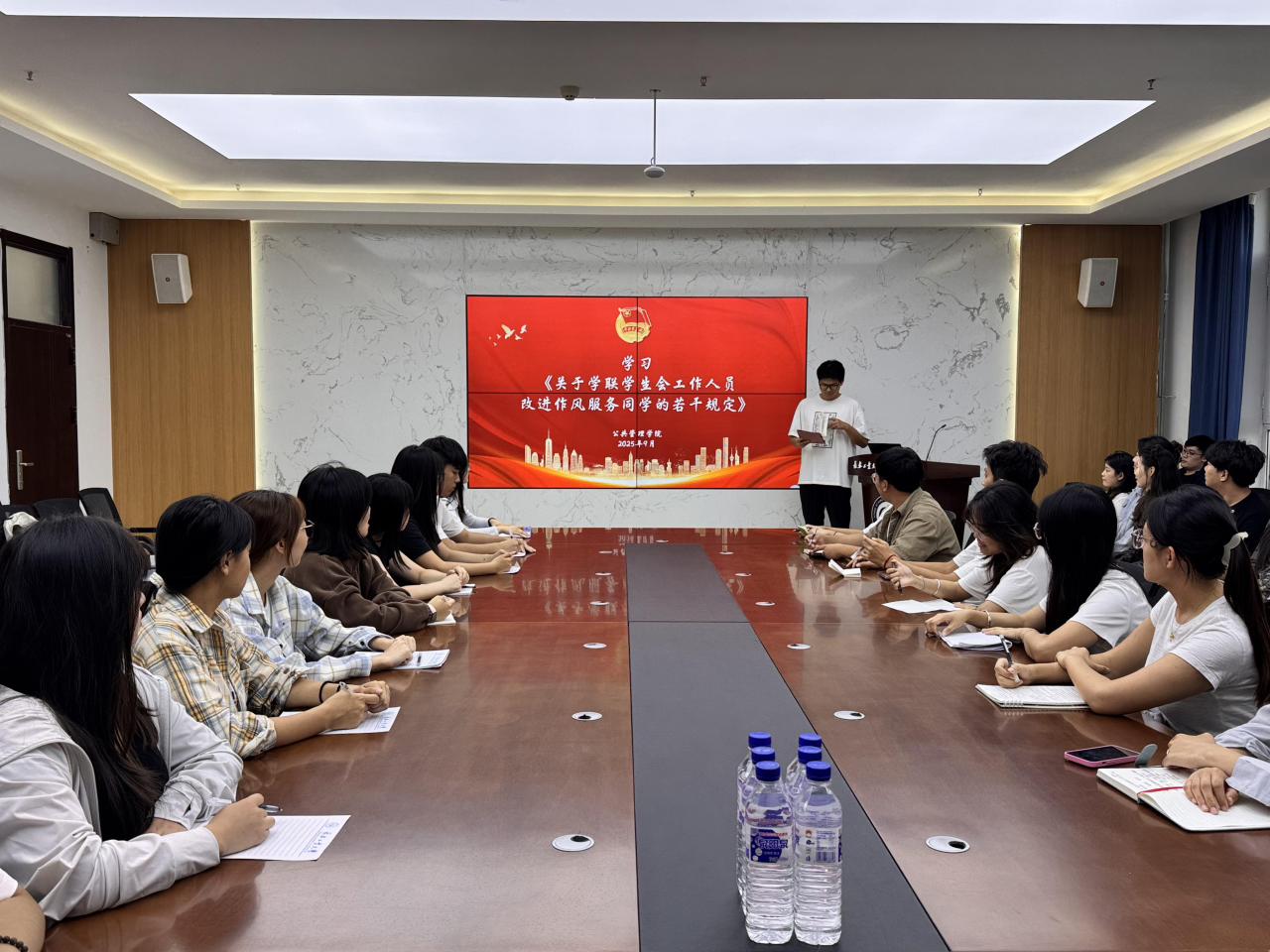 随后,陈首旭同学带领全体与会人员共同学习了《关于学联学生会工作人员改进作风服务同学的若干规定》,并就重点条款进行详细解读。与会同学认真聆听,深入思考,进一步明确了作为学生工作人员的责任与担当。