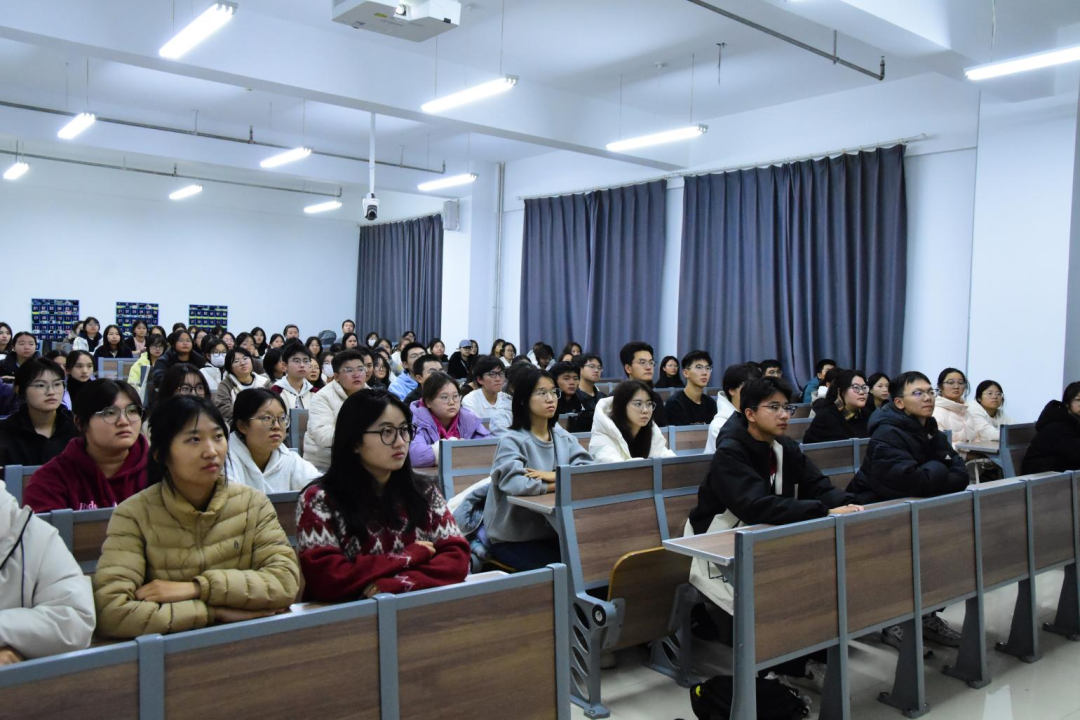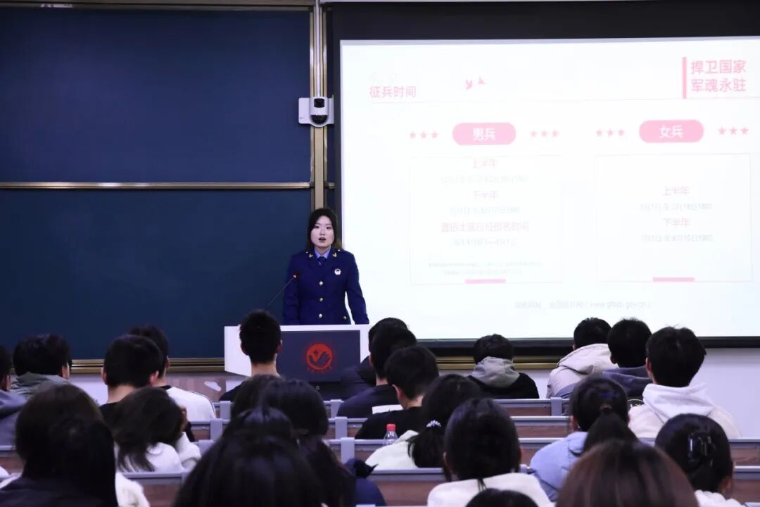 优秀退役学生代表,两位学生代表身着军装,以真情实感激发了同学们对参军入伍的兴趣,围绕“发展有前景”、“学业有保障”、“政策有优待”三大核心问题,以“政策深度解读+军旅生涯分享+实际经验交流”多元模式,为同学们全面细致地讲解了大学生征兵的相关优惠政策以及纳新标准、报名流程等问题。