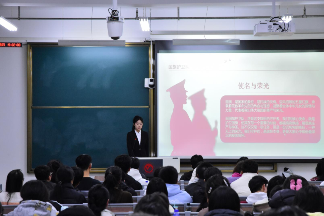 于10月23日晚在北湖东区主教学楼开展征兵宣讲及国旗护卫队纳新动员活动,此次活动聚焦内容宣讲、聚力榜样引领,点燃了同学们的激情。