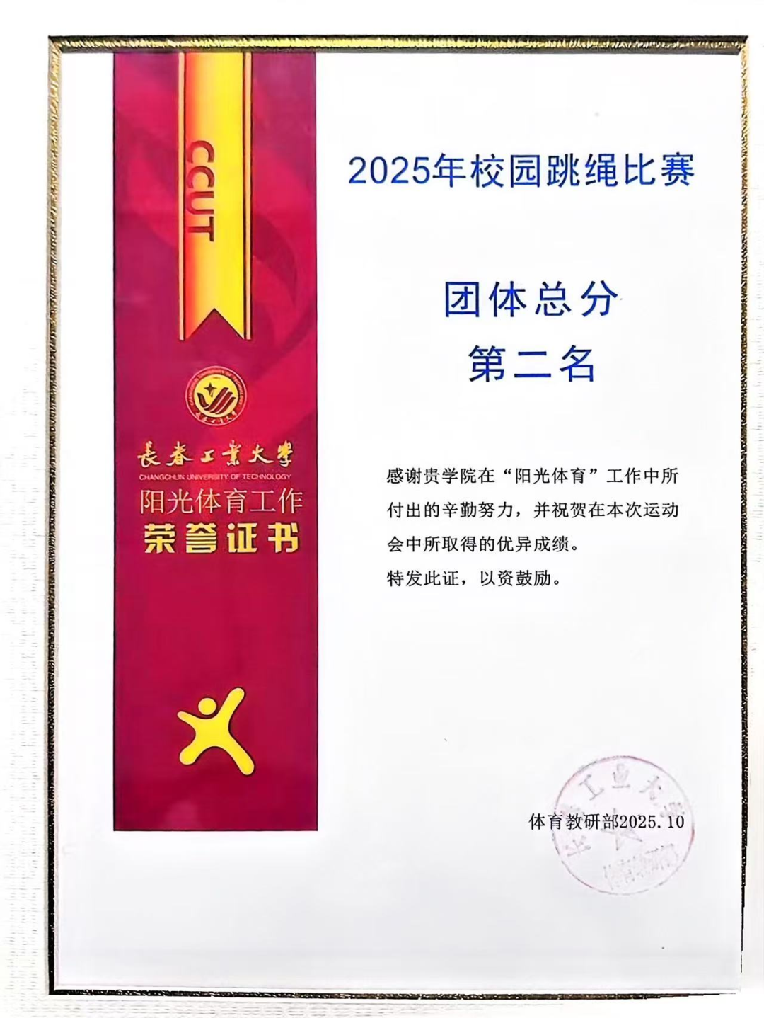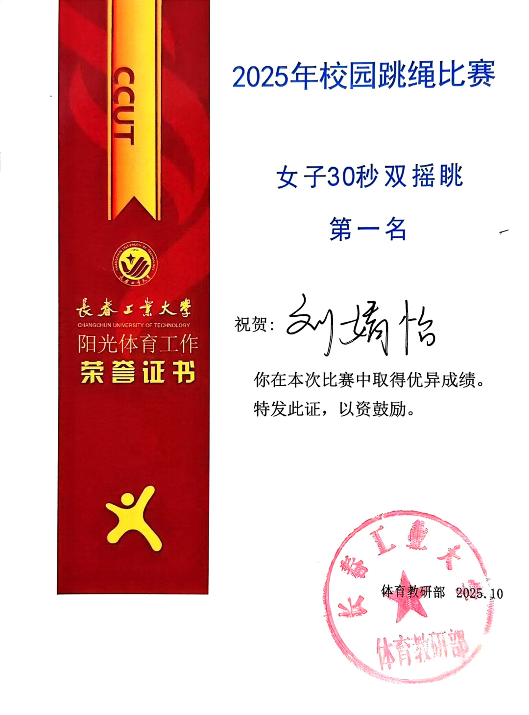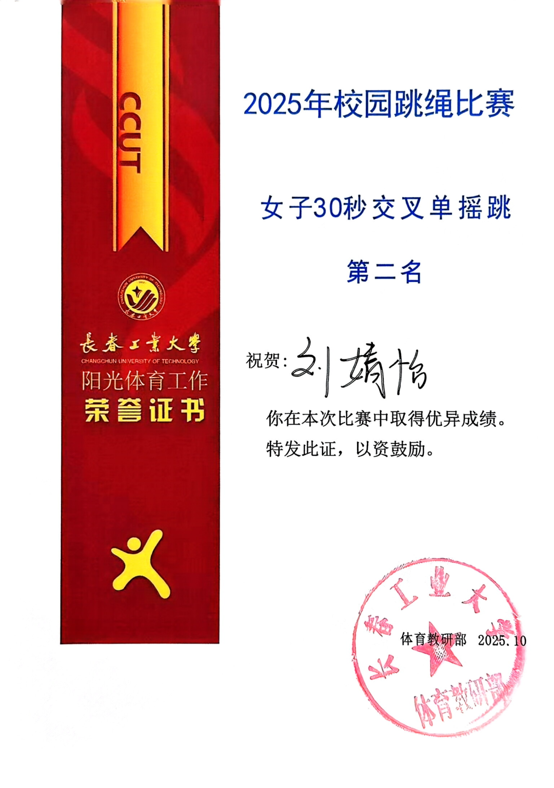 代表队以昂扬的斗志和出色的表现闪耀全场,最终荣获团体总分第二名的好成绩!其中,刘婧怡同学表现尤为亮眼,包揽女子30秒单摇跳、双摇跳第一名及女子30秒交叉单摇跳第二名。