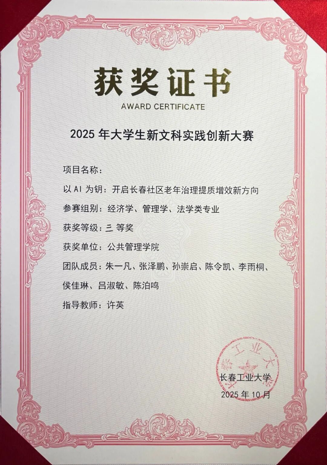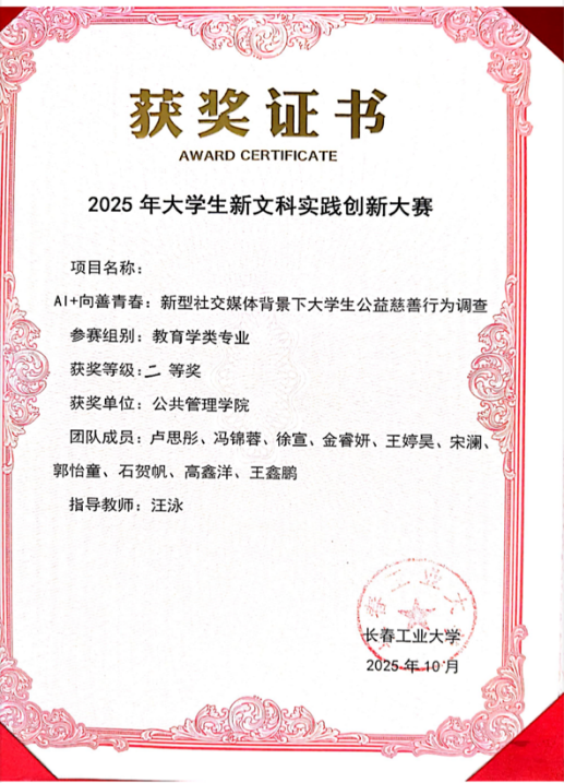 学子在2025年大学生新文科实践创新大赛中凭借扎实的专业素养与创新实践能力,斩获佳绩,充分展现了公管学子在新文科领域的实践创新风采!