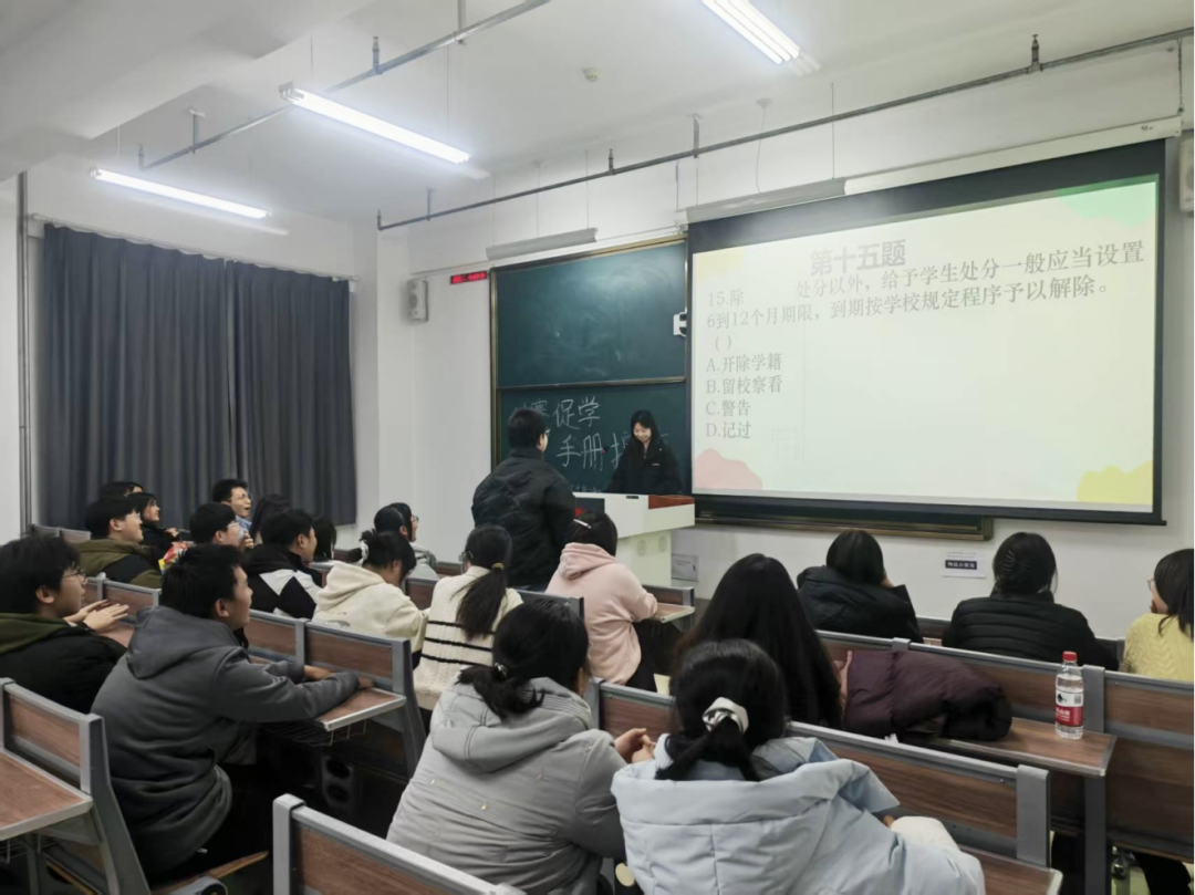 于11月18日晚在北湖东区主楼240教室开展了25级新生知识手册竞赛,本次竞赛以“学手册、守规范、践初心”为主题,通过以赛促学、以赛促行的方式,让学生手册内容深入人心,并且外化于形。