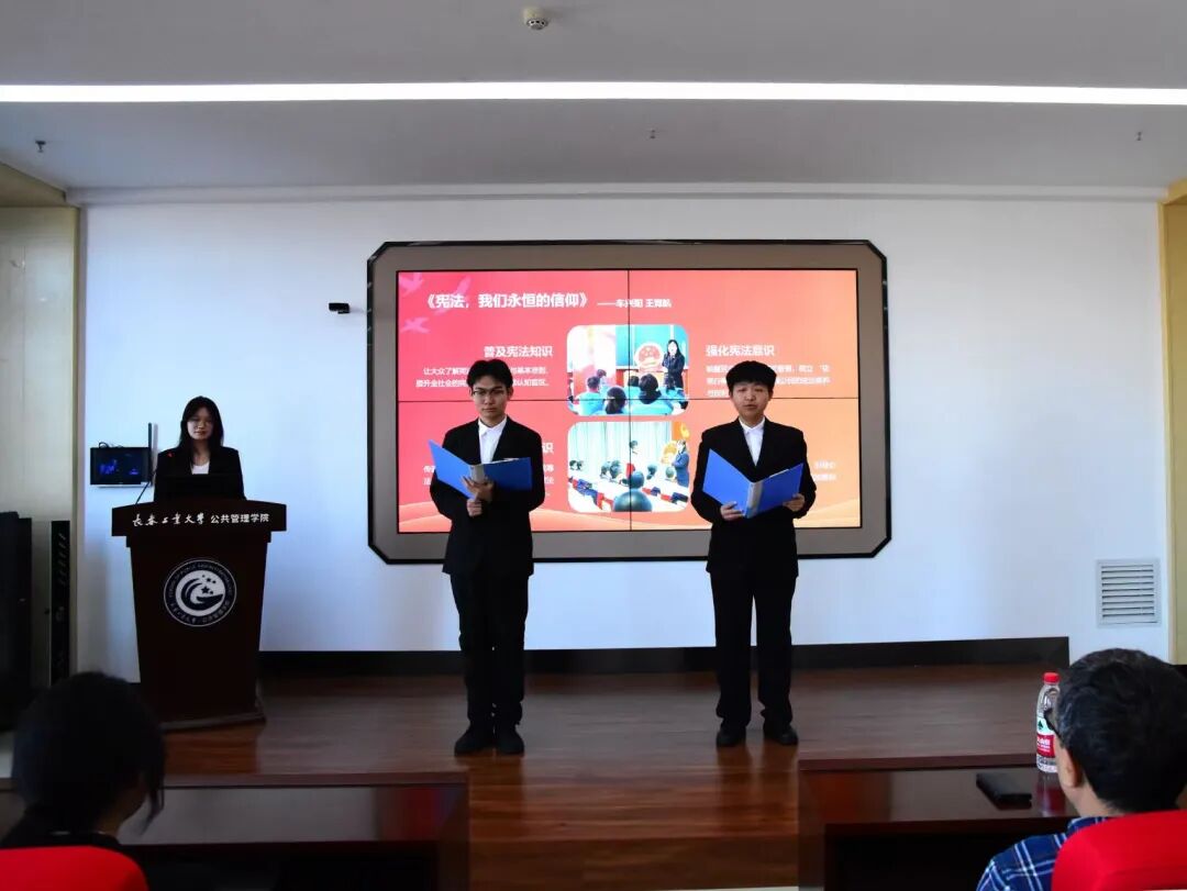 车兴阳、王竞航两位同学以“宪法,我们永恒的信仰”为主题展开演讲。他们从宪法的历史沿革、文本精神出发,结合社会实际,阐释宪法作为国家根本法的重要地位,以及每个人尊崇宪法、践行宪法的重要意义,帮助同学们在理解中筑牢法治信仰的根基。