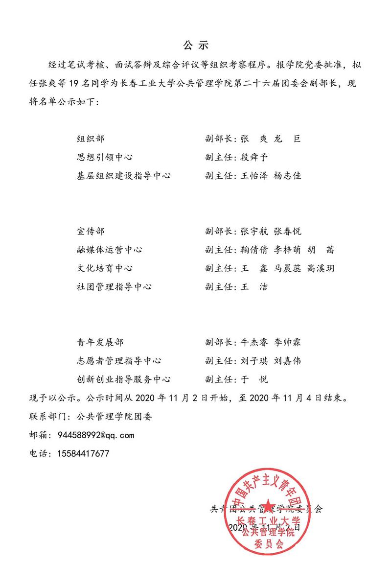 长春工业大学白嫖网 第二十六届团委会学生干部名单公示