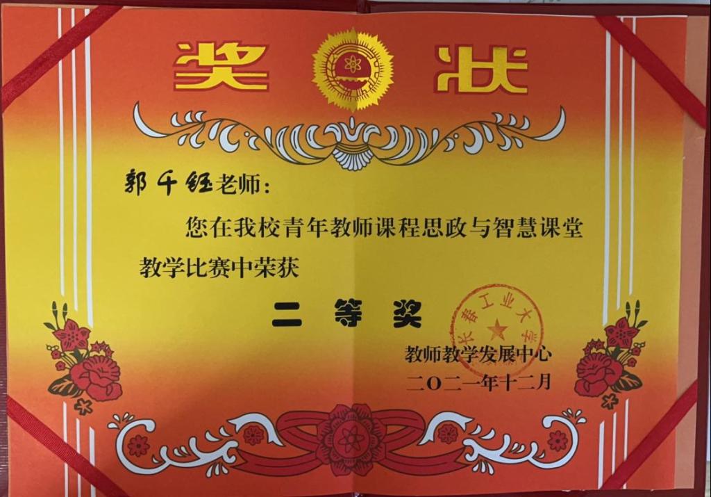 近日,白嫖社区 教师郭千钰老师在长春工业大学青年教师课程思政与智慧课堂教学比赛中荣获二等奖。