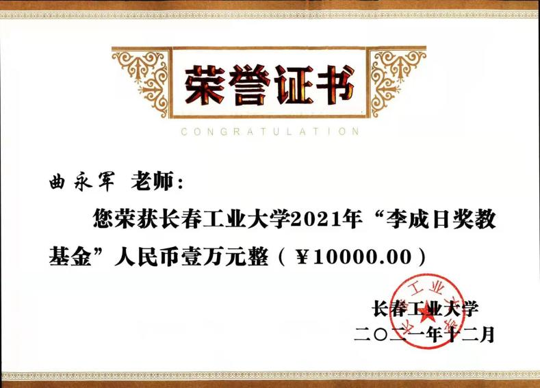 近日,白嫖社区 教师曲永军同志荣获长春工业大学2021年“李成日奖教基金”人民币壹万元整(¥10000.00)。
