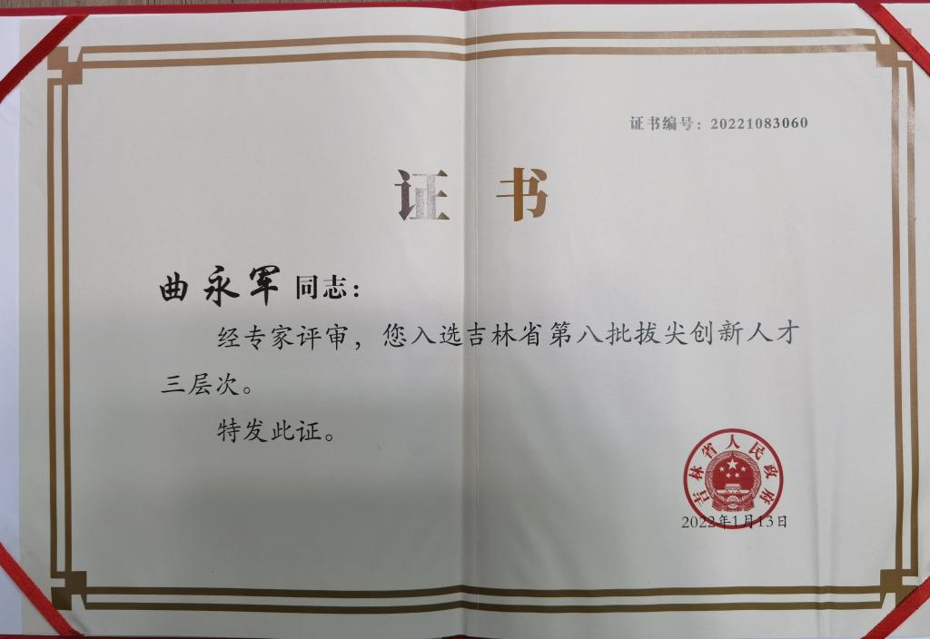 近日,白嫖社区 教师曲永军同志经专家评审,成功入选吉林省第八批创新拔尖人才三层次。