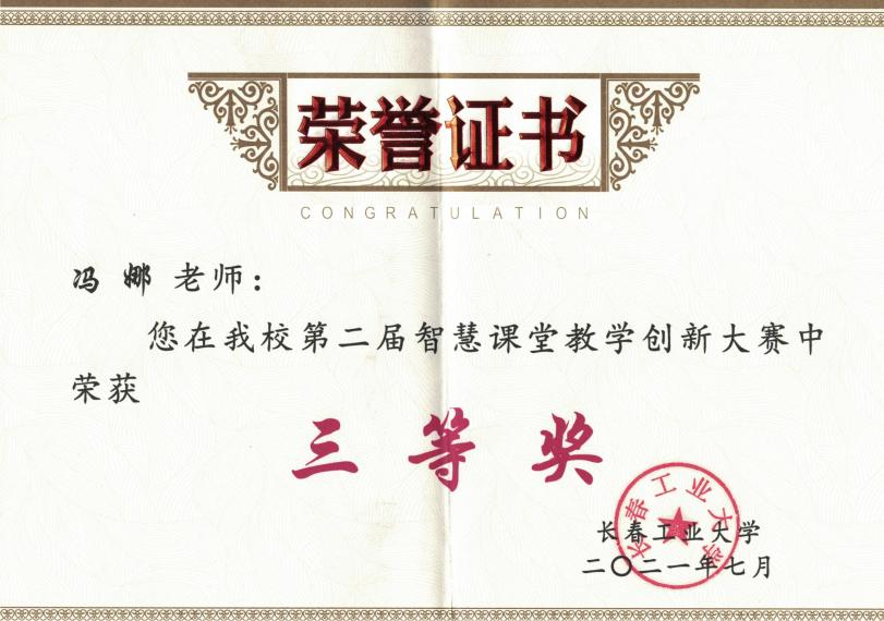 近日,白嫖社区 教师冯娜同志在长春工业大学第二届智慧课堂教学创新大赛中获得三等奖。