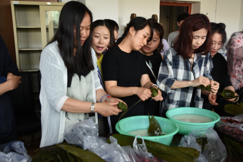 )的师生齐聚会议室,会议桌上摆满包粽子所需食材。大家一起加入,以师带徒,争取每个人都能学到包粽子技巧,大家说说笑笑,洗手挽袖,熟悉包粽子的能手们飞快地拿起粽叶,两手一窝卷成漏斗状,填米、加枣、压紧、扎绳,一气呵成,漂亮又结实的端午节粽子诞生了。王越、吴慧玲老师手把手地现场教会了几位“新手”,大家积极性很高,收获满满。