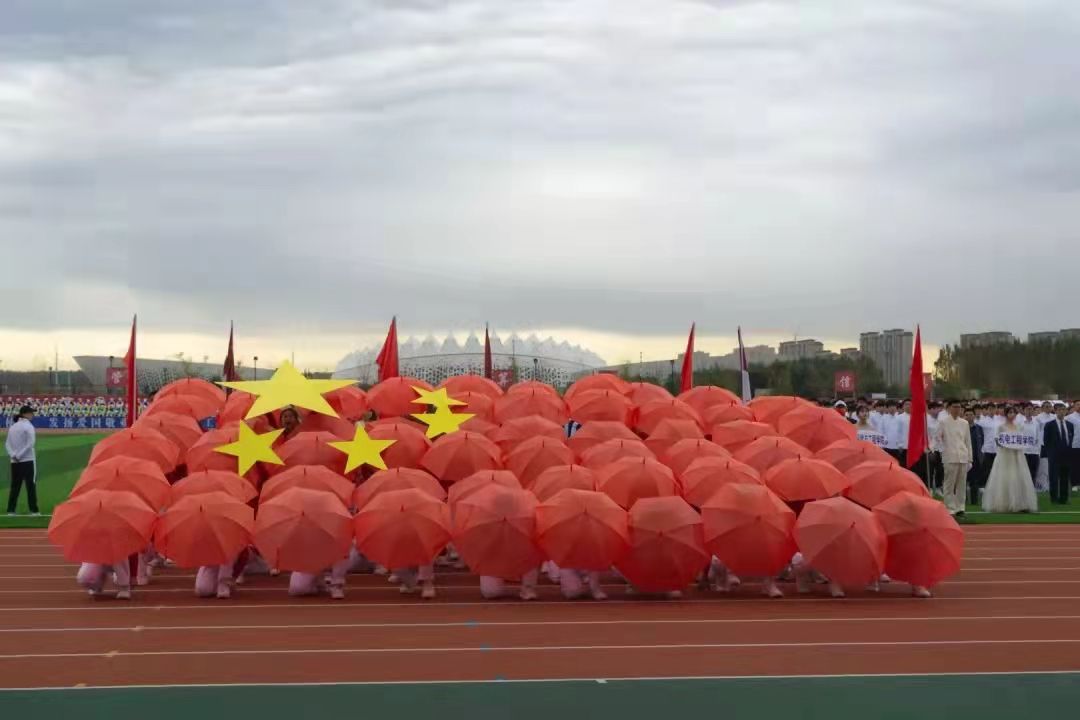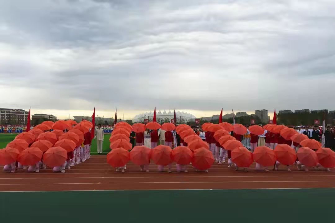 方队入场,他们身着红衣白裤,英姿飒爽。用红伞、党徽、五星摆出党旗、数字100、国旗的图案,整齐的队伍,响亮的口号,向党和国表达最诚挚的祝福。教工队伍,男老师身着西装昂扬阔步,女老师一席漂亮长裙,优雅修整,挥动手中吉祥物,用他们的热情向全校师生致以最亲切的问候。