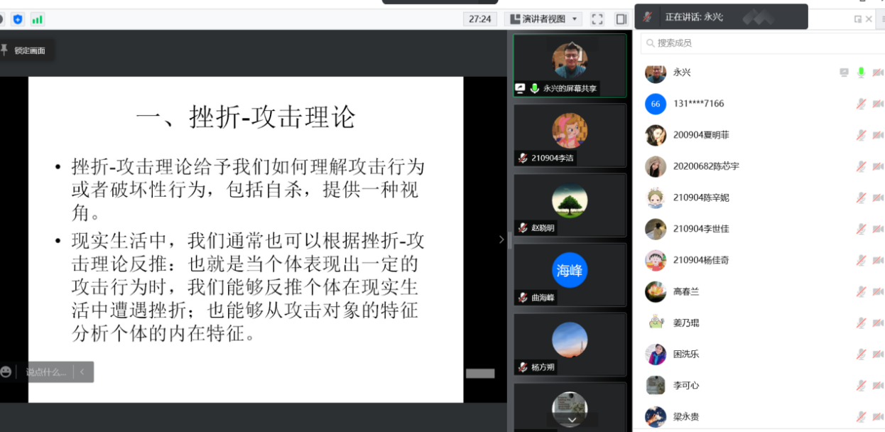 首轮抗疫心理关爱系列讲座第三讲开讲。本期主讲教师为社会工作系刘永兴老师,讲座主题是《疫情封闭环境大学生破坏性行为的发生与消解——基于挫折理论》。此次讲座的目的在于向全校师生普及心理健康知识,在特殊时期为同学们提供心理辅导以及启迪社会工作系的学生在未来实务工作中对于解决问题有更多的思考。