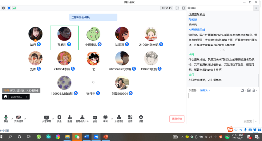 毕丹老师给“横班纵组”同学布置了查阅和梳理有关疫情期间社会工作服务的相关文献的作业,并通过腾讯会议召开组会,请每位同学分享阅读文献的收获和体会。毕老师还邀请了已经毕业的学生参会,这些学生一直工作在社区抗疫一线,有社工也有志愿者,他们给学弟学妹们讲述了社区抗疫前线的情况,理清了在抗疫工作中社工和志愿者的区别,生动展现了当下社区社工和志愿者的实际工作状况。毕老师也为同学们分析了疫情当下人们会产生焦虑情绪的原因,并为学生如何消除不必要的焦虑情绪提供了心理辅导。