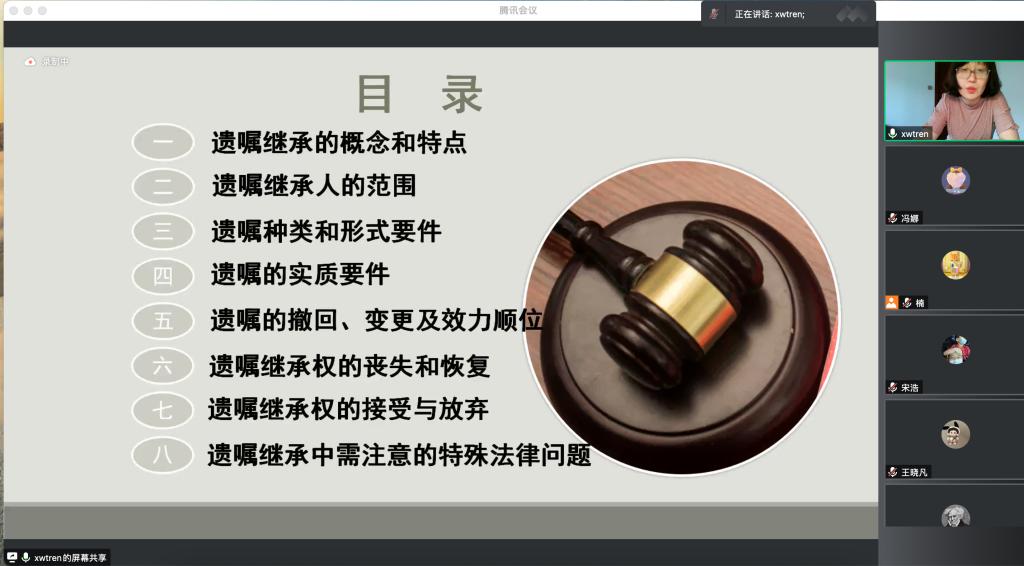 “法律大讲堂”第三季“民法典与美好生活同行”第二讲《<民法典>遗嘱继承法律问题的理解与适用》于2022年4月19日17:30在腾讯会议线上开讲。本期主讲嘉宾是长春市汽车经济技术开发区人民法院审判委员会委员、立案庭庭长沈楠法官。讲座由法学系主任宋浩老师主持,法学系百余名师生旁听讲座。
