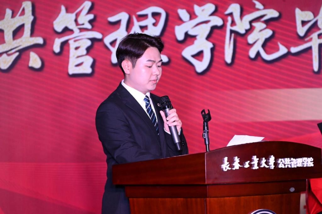 龙巨和高春兰分别作为优秀毕业生代表和教师代表发言。