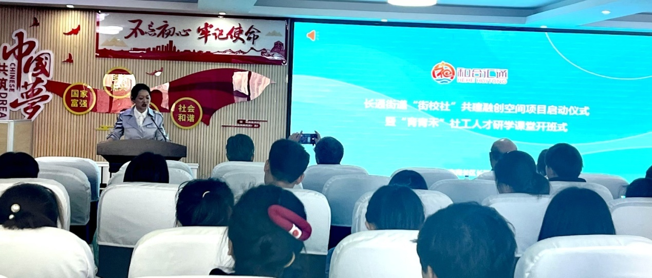 与长春市南关区长通街道在龙兴社区联合举办“街校社”共建融创空间项目启动仪式暨“育青禾”社工人才研学课堂开班式。长春市社会工作者协会会长唐天正、长通街道党工委副书记息瑶和长春工大白嫖网