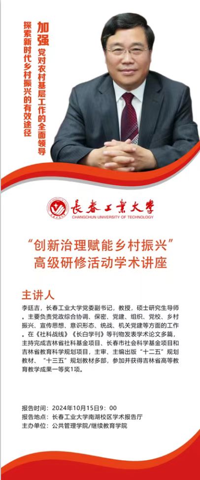 李廷吉,长春工业大学党委副书记,教授,硕士研究生导师,主要负责党政综合协调、保密、党建、组织、党校、乡村振兴、宣传思想、意识形态、统战、机关党建等方面的工作。在《社科战线》《长白学刊》等刊物发表学术论文多篇,主持完成吉林省社科基金项目、长春市社会科学基金项目和吉林省教育科学规划项目,主审、主编出版“十二五”规划教材、“十三五”规划教材多部,参加并获得吉林省高等教育教学成果一等奖1项。