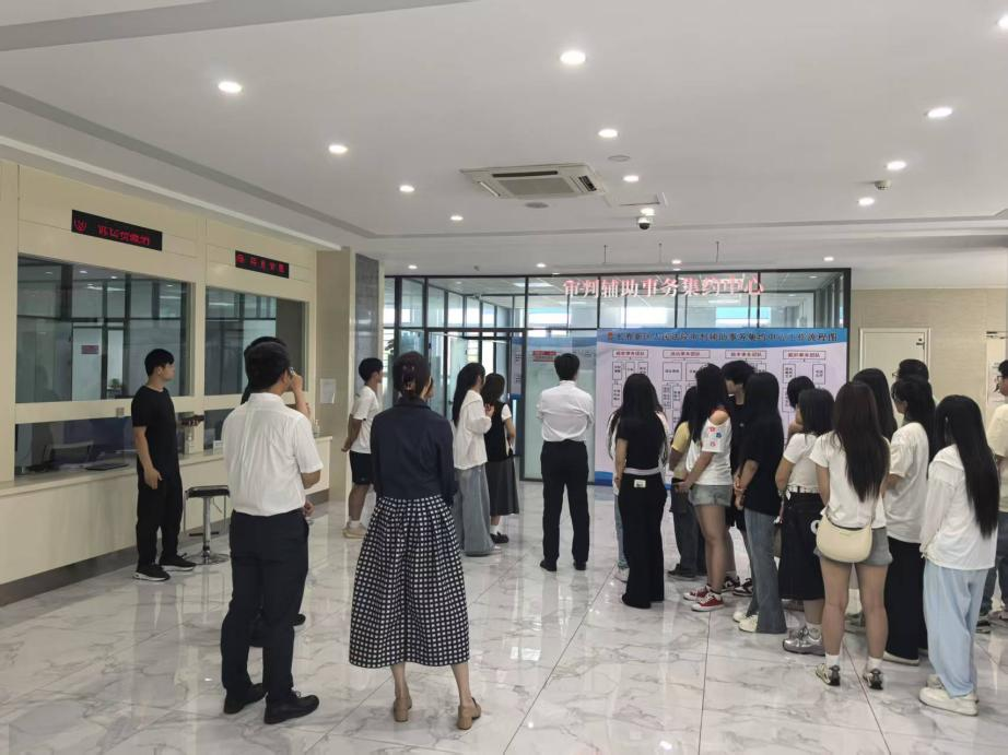 当日上午,同学们怀揣着对法律实践的期待与热忱,有序进入法院。在新区法院立案庭副庭长姜飞飞的引导下,首先参观了诉讼服务大厅。姜飞飞副庭长向同学们详细介绍了立案登记、诉讼引导、多元解纷等功能区的运作模式,直观展现了司法便民的“第一扇窗口”。